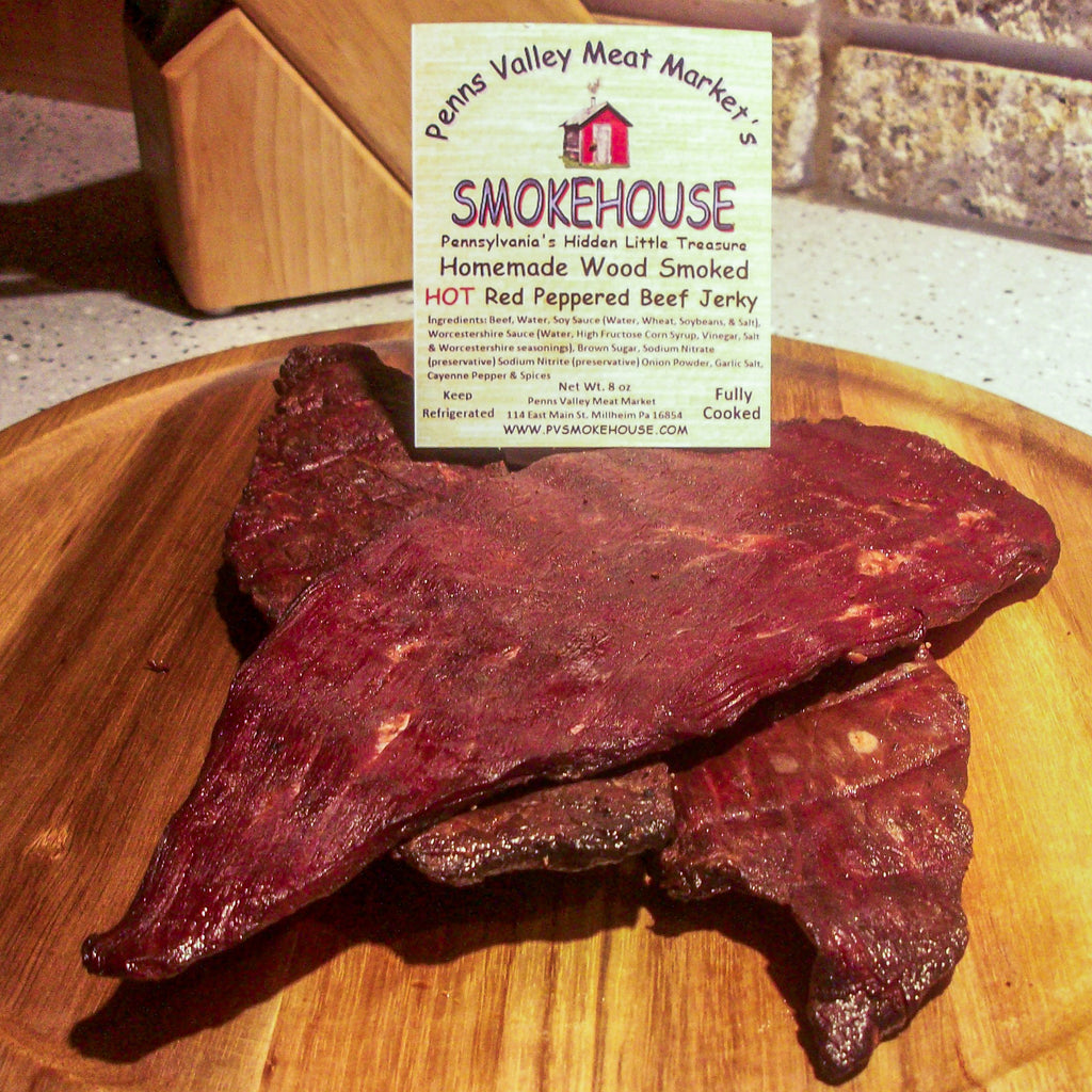 "Hot" Red Pepper Jerky… We started with our plain base and sprinkle cayenne pepper onto each and every piece before we smoke it. Since we are human and some days the pepper wants to come out of the container faster than we prefer, you may have a piece or two that has lots of hot pepper on it and some with just the right amount.